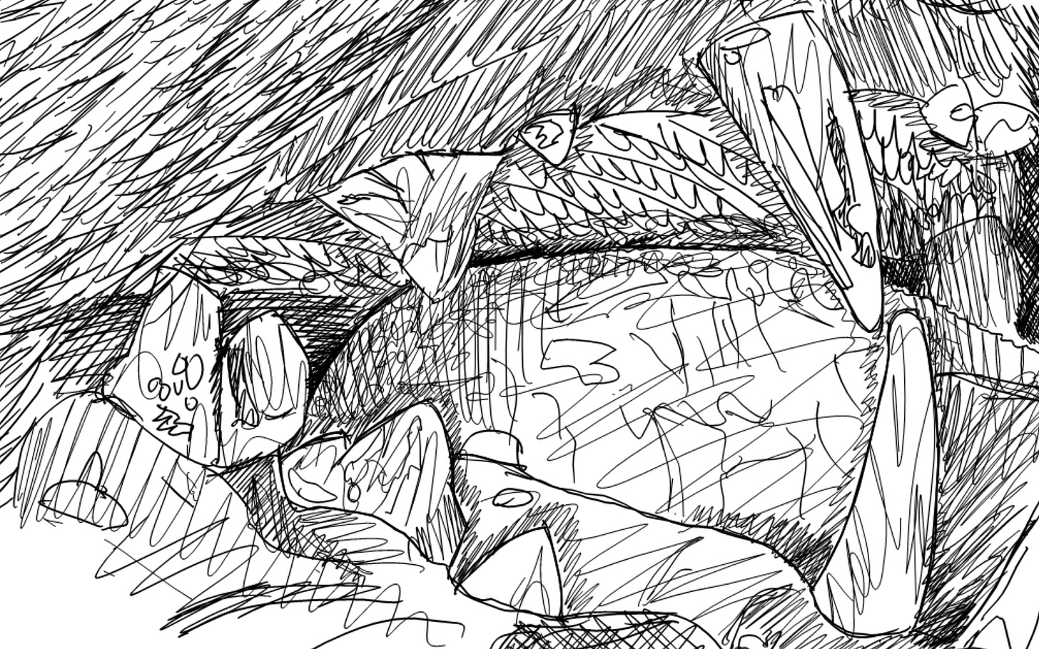 Dunkin, its feet blackened but unbothered, jumps up next to Jenny. It curls up next to her and yawns, its mouth coated in moving symbols, washing around its teeth and gums. The yawn turns to gurgle as dank fluid appears from down inside its throat. Dunkin is unconcerned and snuggles harder.